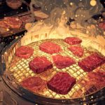 深夜に見たら終わる飯テロアニメ「東京2299一人焼肉」の網の上の焼肉のシズル画像